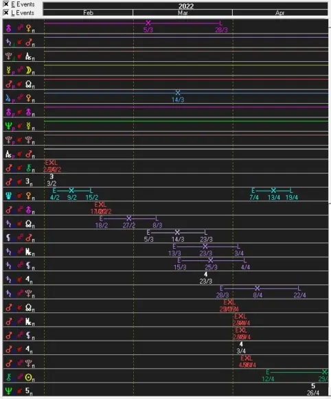 Hier habe ich mit der fiktiven Geburtszeit wichtige Transite der nächsten Wochen ausgerechnet. Saturn Mondknoten (18.2.-8.3.) wird ihn zu Größenwahn veranlasst haben. Diese Konstellation gibt es ca. alle 30 Jahre. Er dachte, die Erfahrungen der vergangenen Jahre machten in jetzt zum rechtmäßigen, asoluten autokratischen Herrscher. Mars läuft auf diesen Mondkonten noch einige Tage (bis Ende März) zu, was ihn reizbar und noch gefährlicher macht.Der schwarze Mond läuft in Opposition Radixmars vom 5.3.-23.4. eine Killerkonstellation. Man MÖCHTE töten. Am 5.3. war die Konstellation Venus mit Uranus exakt, was zu einem erheblichen atomaren Gefahrenpotential geführt hat. Wohl nur durch Glück sind wir einer Kernschmelze im angegriffenen Atomkraftwerk entgagen. Diese Konstellation läuft bis 28.3. aus, was noch keine Entwarnung verspricht. vom 15.3.-4.4. transisitert Saturn den Radix schwarzen Mond, was größere Zerstörungen von Gebäuden und Infrastruktur bringen kann, aber auch für ihn selbst nicht ganz ungefährlich ist. Seine scheinbaren Gegener erscheinen im noch gefährlicher und zerstörenswerter als vorher. 28.3.-22.4. könnte durch Saturn Opposition Radix Pluto eine wahre Zerstörungsorgie losgetreten werden. Alles im vermeintlichen Zustand, das "richtige" zu tun und die "Abtrünnigen" wieder "heim ins Reich" zu holen oder mit Stumpf und Stiel auszurotten. Gleichzeitig ist die Konstellation Transitmars am aufsteigenden MK Ende März exakt. Eine gefährliche Eskalationskosntellation, bei der er noch einmal alle Register ziehen könnte...DOCH was ist, wenn die Konstellationen, die diesen Feldzug bis dahin befeuern, plötzlich nachlassen? Anfang April transistiert der Mars den Radix schwarzen Mond und könnte viele Tote verursachen (wollen). ABER am 12.4. beginnt seine Konstellation mit Chiron Sonne. Ist er dann schon Herrscher der Ukraine, oder geht ihm die autoritäre "Luft" aus. Mars Opposition Pluto, ebenfalls Anfang April, wird er vielleicht noch mit Gewalt ausagieren können. Danach ist "Sense". Saturn, Mars und Venus laufen aus dem 3. Haus (Angriff auf die nähere Nachbarschaft) ins 4. Haus, sofern die angenommene Geburtszeit plausibel ist. Sein eigenes Land, seine eigene Bevölkerung, seine "Familie" könnte die Unterstützung verweigern. Was wird er dann ernten. Diese starken Saturn und Mars-Aspekte geben ihm Kraft, Energie und Durchhaltevermögen. ABER hat er Astrologen, die ihm die Phasen mit ihren Auf- und Abs erklären oder schwelgt er in dem Gefähl, was er jetzt glaubt zu erreichen oder erreicht zu haben, würde seiner Grundkonstellation und zukünftigen Kraft entsprechen. Man muss jedoch auch sehen, dass einiger dieser Transite noch einmal in den nächsten Monaten zurückkommen. Wer weiß, wie dann die Ausgangslage ist.