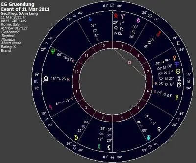 Astrologisch gesehen ist im Gründungshoroskop der europäischen Gemeinschaft eines besonders deutlich zu erkennen: Technikfixiertheit! Aufsteigender Mondknoten in Skorpion bedeutet, dass man alte traditionelle Agrargesellschaften (Gegenzeichen Stier) hinter sich lässt. Sozusagen mit aller Gewalt ohne Erkennen von Folgen (Neptun steht beim aufsteigenden Mondknoten) arbeitet man am technischen Fortschritt. Genau dies wird symbolisiert durch Herrscher Pluto zehnten Haus, der in Konjunktion mit Zeus das angestrebte Ziel markiert. Pluto steht für die Gewalten, die man bereit war zu mobilisieren. Darunter auch die Kernenergie. Die markante Stellung von Pluto und Zeus zeigt, dass es (der Politik!) beinahe einzig und allein darum ging, technische Fortschritte zu generieren und voranzutreiben. Der Wendepunkt konnte eintreten, als der sekundär progressive MC endlich diese Pluto/Zeus-Kombination transitierte: Fukushima.