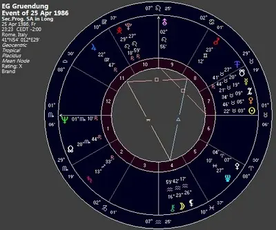 Aber selbst, wenn man damals (1986) auf die Mahner gehört hätte, das Ziel blieb vorerst weiterhin (Pluto und Zeus, beide Repräsentanten plutonischer Techniken im zehnten Haus) mit aller Macht, und notfalls auf „Pump“, Technik, Wissenschaften und Atomziele weiter zu betreiben. Das ganze Spiel konnte also erst unterbrochen werden, als der MC über diesen markanten Punkt hinweg ging und die bis dato gültige (politische) Zielsetzung „Atom“-Technik schließlich ins neunte Haus wanderte. Gleichzeitig verlief der sekundärprogressive Aszendent auch über den aufsteigenden Mondknoten und in der Sekunde war quasi im wahrsten Sinne des Wortes aus der Atomenergie, zumindest bei uns, die Luft heraus.