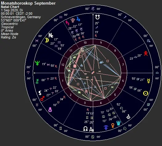 Für die Berechnung setze ich das jeweilige Sternzeichen (also den Sonnenstand) an den Aszendenten. So kann man ablesen, wie der Mensch in dieser Zeit in die Welt blickt und welche Handlungsspielräume sich dadurch ergeben. Bei Sternzeichen Widder wäre für die Monatsberechnung, oder ebenso bei Jahreshoroskopen, also Widder der Aszendent (siehe Horoskopbeispiel). Von dort aus verteilen sich die Planeten in die verschiedenen Quadranten des Kreises. Je nachdem, wo die Planeten dann stehen, wirken sie auf die Lebensbereiche des Sternzeichens. Das 2. astrologische Haus steht für die Finanzen. Wenn nun also ein für die Finanzen nachteiliger Planet, durch den Tierkreis wandert, steht er folgerichtig nach und nach zuerst im Geldhaus des Widders, dann im Geldhaus des Stieres usw. Ebenso werden auch alle anderen Lebensbereiche sozusagen reihum für die Sternzeichen relevant. Wer die Monatshoroskope langjährig verfolgt, wird dieses System auch in den Interpretationen erkennen. Die Planeten haben unterschiedliche Umlaufzeiten zwischen ca. einem Monat (Mond) und 249 Jahren (Pluto). Deshalb kann solch ein Einfluss auf einen der Lebensbereiche teilweise recht lange oder nur ein Augenzwinkern dauern. Beim Sternzeichen Widder bestehen derzeit einige Probleme: so steht seit Anfang des Jahres Chiron im Sternzeichen Widder, zudem sich auch noch der schwarze Mond gesellte. Diese Kombination wirkte auch zur Zeit der Spanischen Grippe und sorgte für aggressive (Widder) Ausbreitung von tödlicher (schwarzer Mond) Krankheit (Chiron). Zur Zeit der Spanischen Grippe stand der schwarze Mond allerdings im Sternzeichen Waage, wirkte also als Opposition dennoch sehr stark. Seit Anfang Juli steht im Sternzeichen Widder auch der Mars, der unüberlegtes Handeln verstärkt. Durch das Quadrat zum Sternzeichen Steinbock neigen also Menschen zu unüberlegtem Verhalten und dazu, sich Regeln (aus Prinzip...) widersetzen zu wollen. Im September zeigt das Widderhoroskop eine Sonne im 6. Haus. Die Gesundheit ist also der wichtigste Focus und muss auch von eher rigorosen und unbelehrbaren Menschen anerkannt werden.